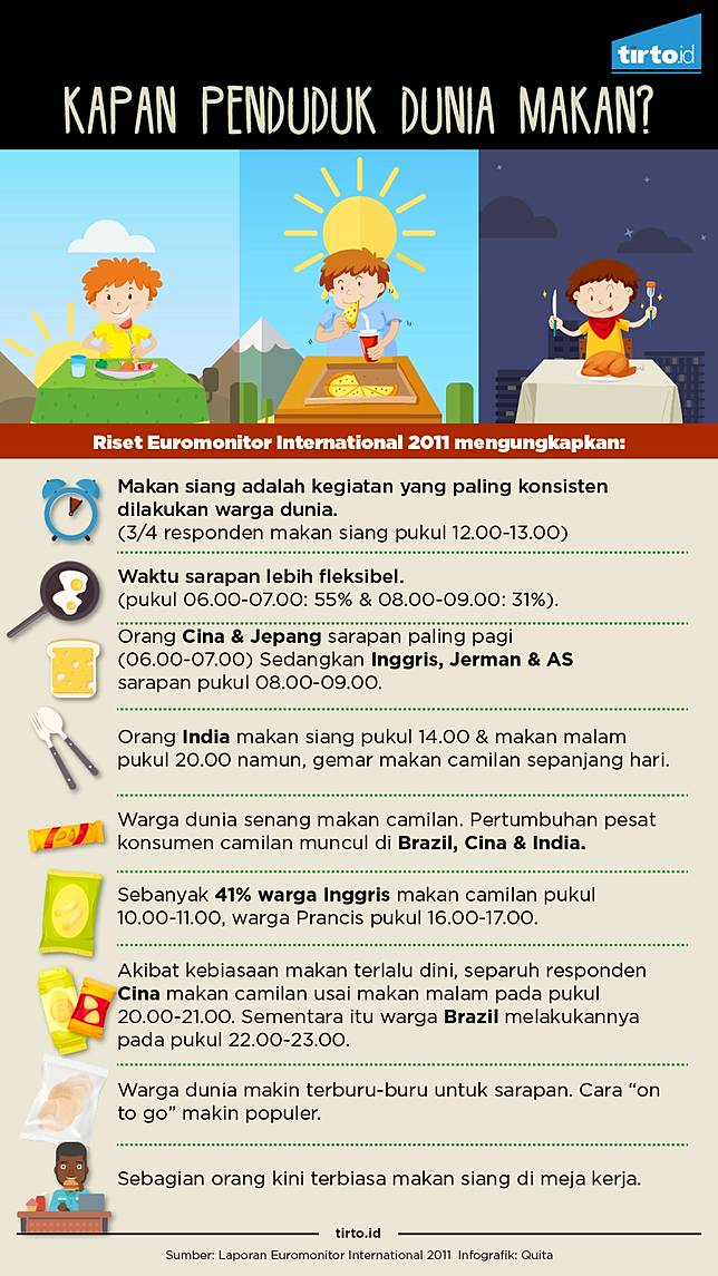 Akibat kebiasaan makan terlalu dini, separuh responden Cina makan camilan usai makan malam pada pukul 20.00-21.00. Warga Brasil melakukannya pada pukul 22.00-23.00. Sementara itu, cara makan camilan orang Perancis dan Inggris lebih diatur jamnya. Sebanyak 41 persen warga Inggris makan camilan pukul 10.00-11.00, sedangkan warga Perancis pukul 16.00-17.00.