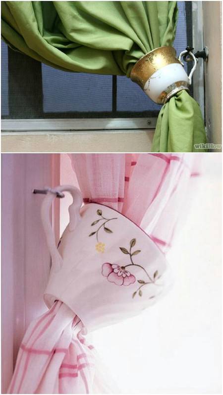 Cangkir lawas yang warnanya senada, bisa dijadikan penahan gorden.